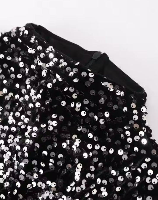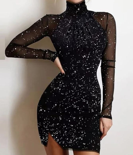 High Neck Sheer Sleeved Sparkle Dress in Black
