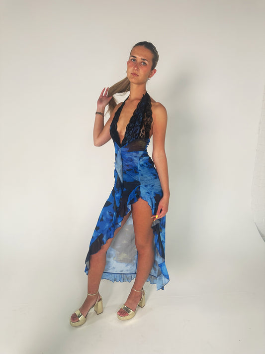 Lace Halter Plunge Dress in Blue